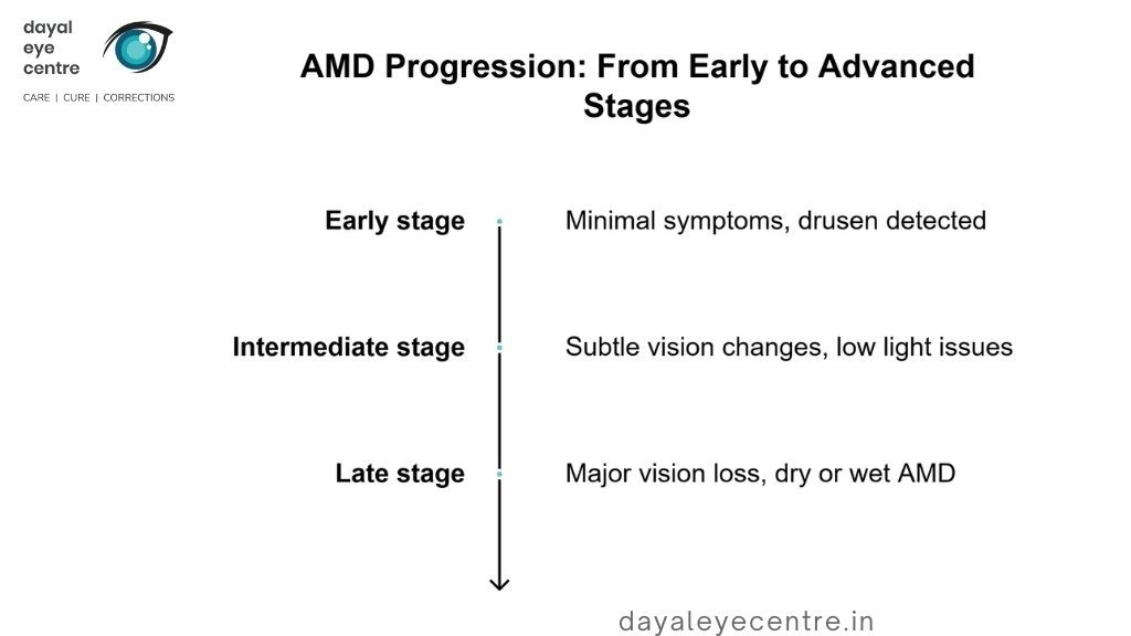 AMD progresses through defined stages, although not everyone experiences each stage: